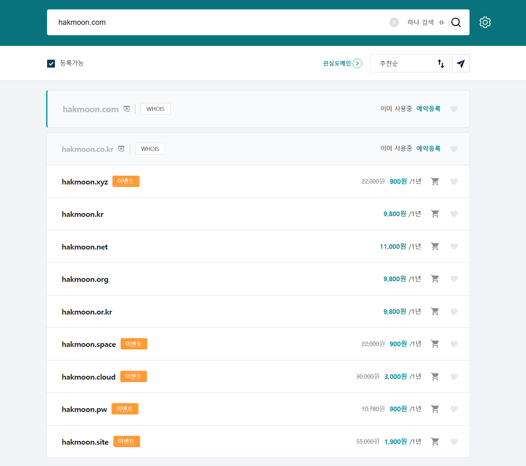원하는 도메인을 검색하신 후, 이미 사용중인 도메인을 제외한 도메인들 줄에서 도메인을 구매하여 사용하시면 됩니다.